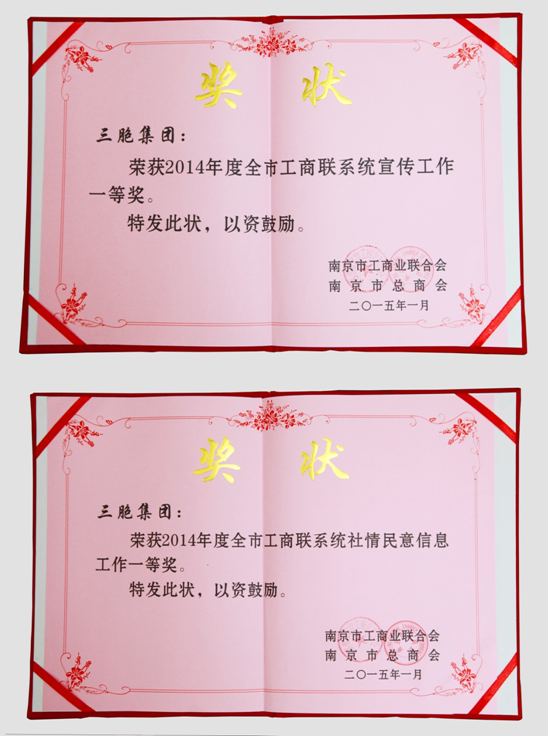 近日,在南京市工商业联合会开展的2014年度全市工商联系统宣传工作先进单位评选活动中,三胞集团荣获由南京市工商联、南京市总商会颁发的“2014年度全市工商联系统宣传工作一等奖”、“2014年度全市工商联系统社情民意信息工作一等奖”两个奖项。