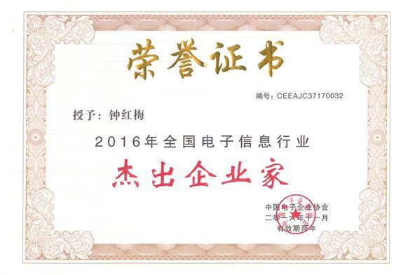 “全国电子信息行业优秀企业家”评选活动每两年举办一次,旨在培育全国电子信息行业优秀经营管理者队伍,树立先进典型和标杆,增强企业核心竞争力,充分发挥企业家在推动科学发展,加快经济发展方式转变中的重要作用。经广东省电子行业协会推荐、中国电子企业协会初审和专家组的评定,广州金鹏集团总裁陈谨和金鹏电子信息机器有限公司总经理钟红梅从全国众多优秀企业家中脱颖而出,双双入围并获奖。