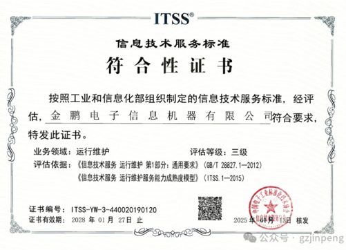 近日,金鹏电子信息机器有限公司成功通过ITSS(信息技术服务标准)符合性三级换证评估,标志着企业在信息技术服务领域的标准化、规范化管理能力持续符合国家权威标准,并进一步巩固了行业领先地位。此次评估是每三年一次的周期性复审,旨在验证企业服务能力的持续性与改进成效,金鹏凭借扎实的体系运行和卓越的服务质量,再次赢得专家组的充分肯定。
