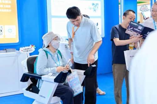 安康通展台特别设置的“养老体验区”,为参观者带来了沉浸式的数智康养体验。脑功能障碍治疗仪、步行辅助器、点餐机、理疗灯等适老化展品引发了参观者的浓厚兴趣,展台参观者纷纷驻足体验,切实感受这些产品为老年人生活带来的便利。一位82岁老人体验完无人驾驶轮椅后感慨:“坐上去比儿女推得还稳当,以后出门再也不犯怵了。”年轻参观者则对“家庭适老化改造20510户”等数据表现出浓厚兴趣,不少人现场扫码咨询适老产品定制服务。