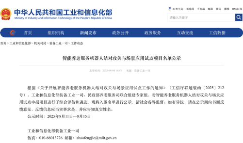 为积极应对人口老龄化的严峻挑战,国家工业和信息化部与民政部联合开展智能养老服务机器人结对攻关与场景应用试点工作,试点期从 2025 年持续至 2027 年。