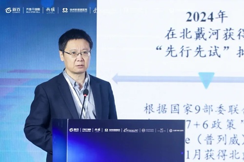 据悉,北戴河维元医院是全国首个开展普列威临床“先行先试”的医疗机构,得益于北戴河生命健康产业创新示范区的核心地域优势,同时依托“国家 - 省 - 示范区”三级政策支持。峰会现场,北戴河生命健康产业示范区管委会副主任田力男上台致辞。