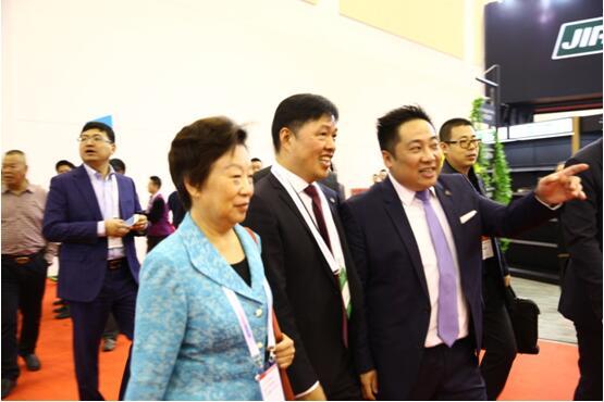 中国连锁经营协会会长郭戈平(左一),协会轮值主席、步步高董事长王填(中),在乐语通讯总裁朱伟陪同(右一)下,参观Hi-shop未来体验店