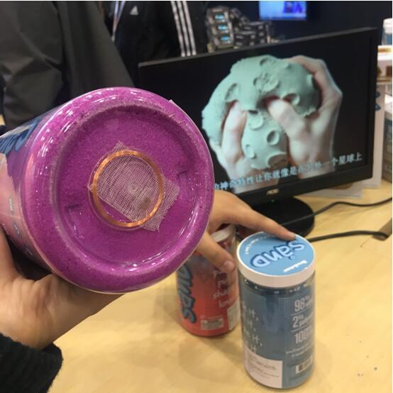随便拿起桌上的一罐粘沙产品看一下,桌面上正在播放的其他广告马上中断,转而变成了粘沙的广告宣传,告诉你怎么玩。Hi-shop店工作人员介绍,粘沙的底部装了一个RFID芯片,当你拿起它,这个芯片就会发一个信号出来,广告就会变换。