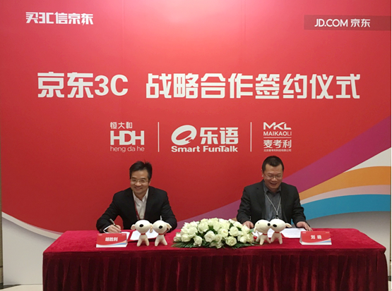 三胞乐语运营副总裁刘晓(右)、京东集团副总裁、3C事业部总裁胡胜利(左)