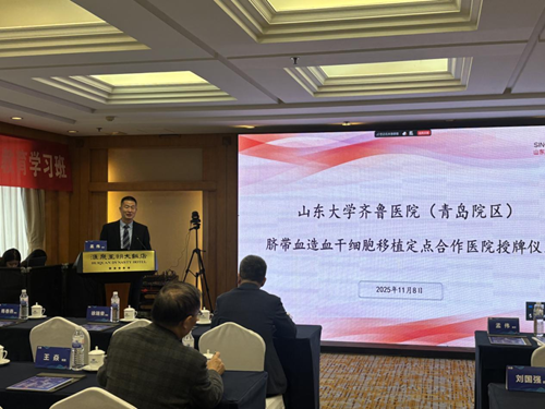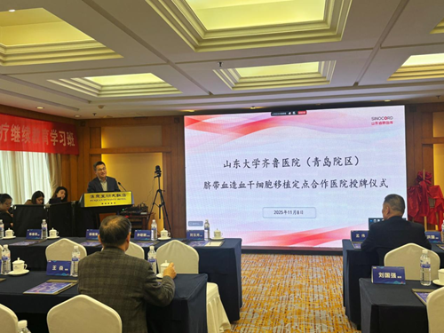 近日,山东省脐血库与山东大学齐鲁医院(青岛院区)举办脐带血造血干细胞移植定点医院揭牌仪式。山东大学齐鲁医院(青岛院区)副院长孟伟,山东省脐血库采集中心主任、山东省齐鲁干细胞工程有限公司副总裁宋现收出席仪式,医院血液科主任郭冬梅主持仪式。此次合作标志着双方在脐带血领域的资源整合与临床应用迈入新阶段,将为区域血液疾病患者带来更多治愈希望。