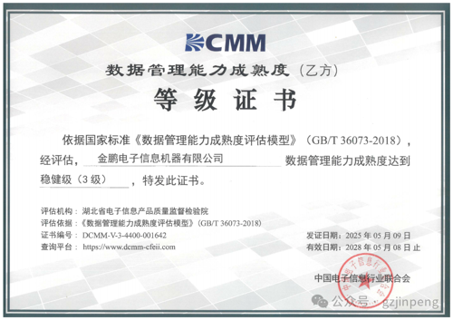 近日,金鹏电子信息机器有限公司通过了数据管理能力成熟度评估(Data Management Maturity Model,简称DCMM),获得DCMM稳健级证书,标志着公司在数据管理领域的综合实力得到了国家级权威机构的认可。