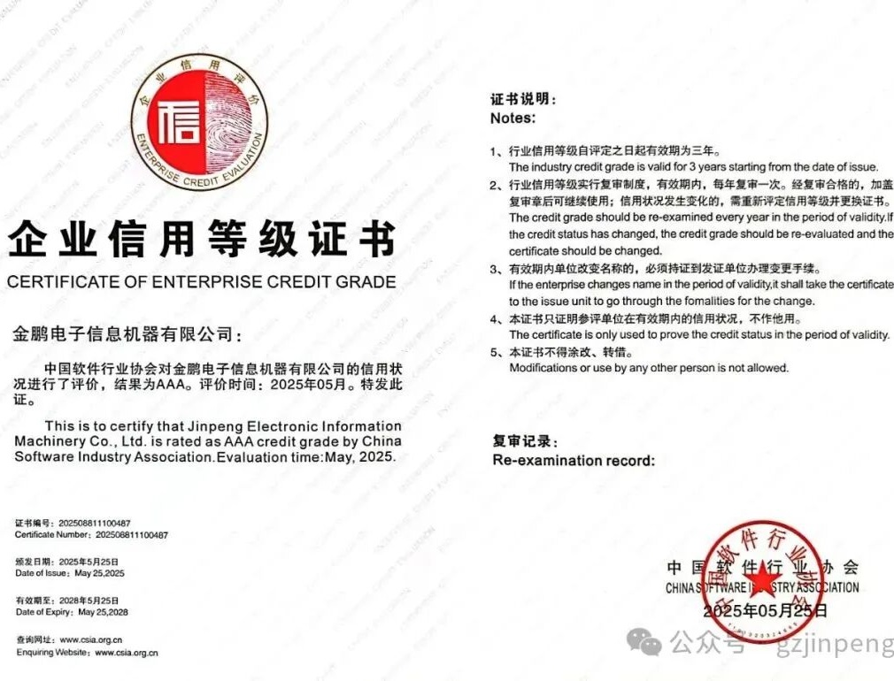 2025-06-27近日,金鹏电子信息机器有限公司通过中国软件行业协会的严格审核与认证,再次荣获“企业信用AAA等级”证书,这是企业信用最高等级证书。信用评...