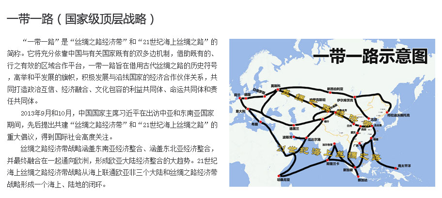 2014年中央经济工作会议提出“一带一路”是2015年区域发展的首要战略,会议提出要重点实施“一带一路”、京津冀协同发展、长江经济带三大战略,争取2015年有个良好开局。 |